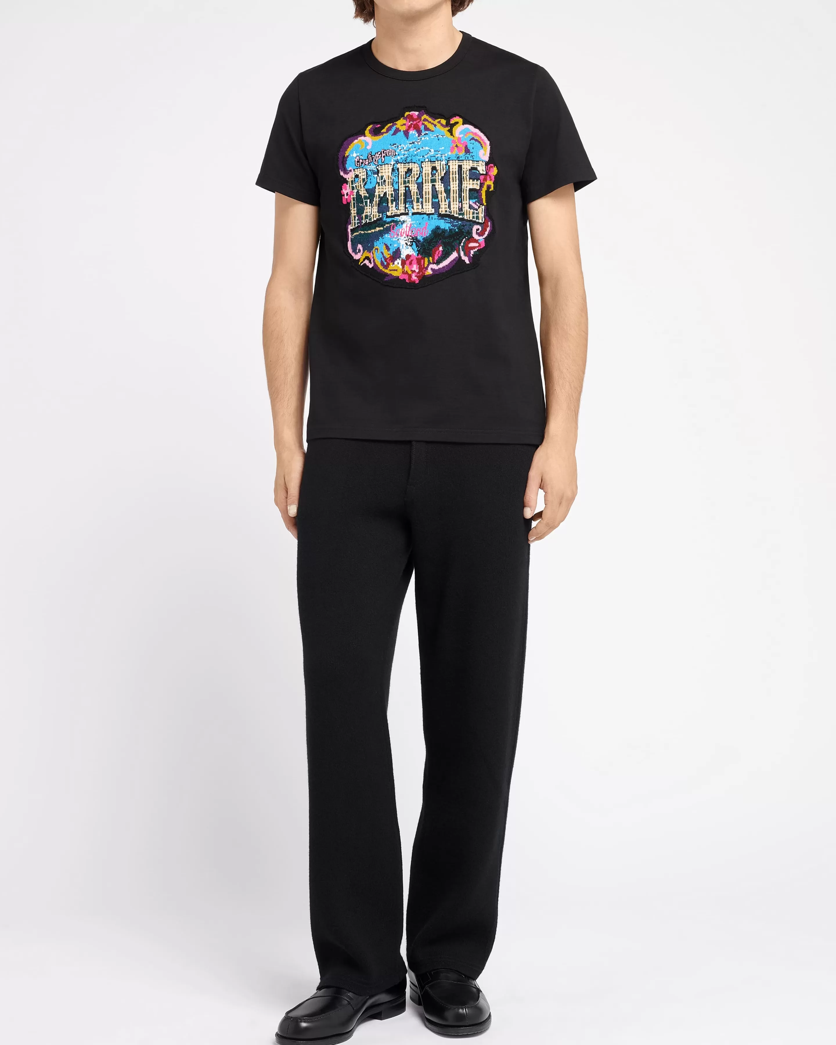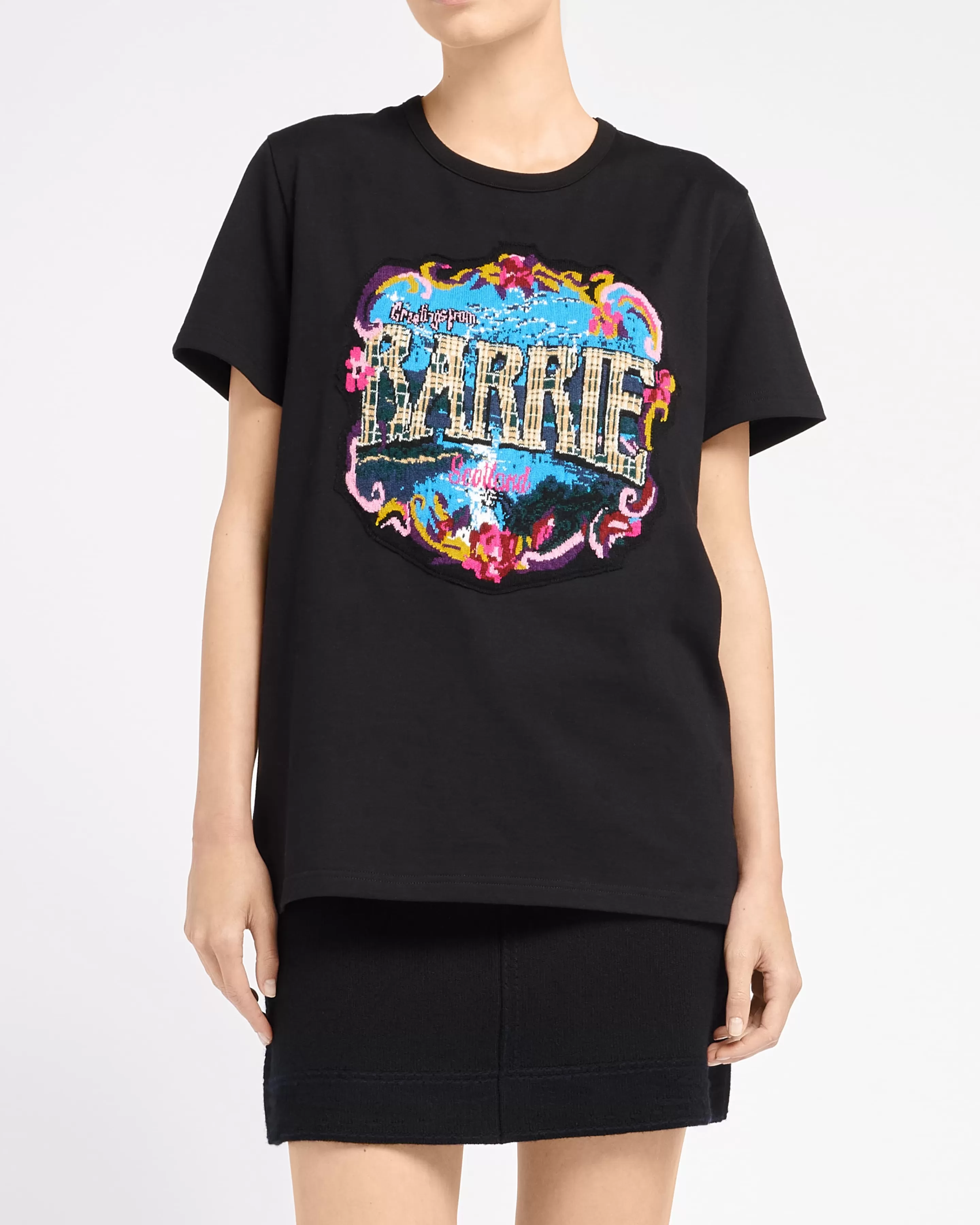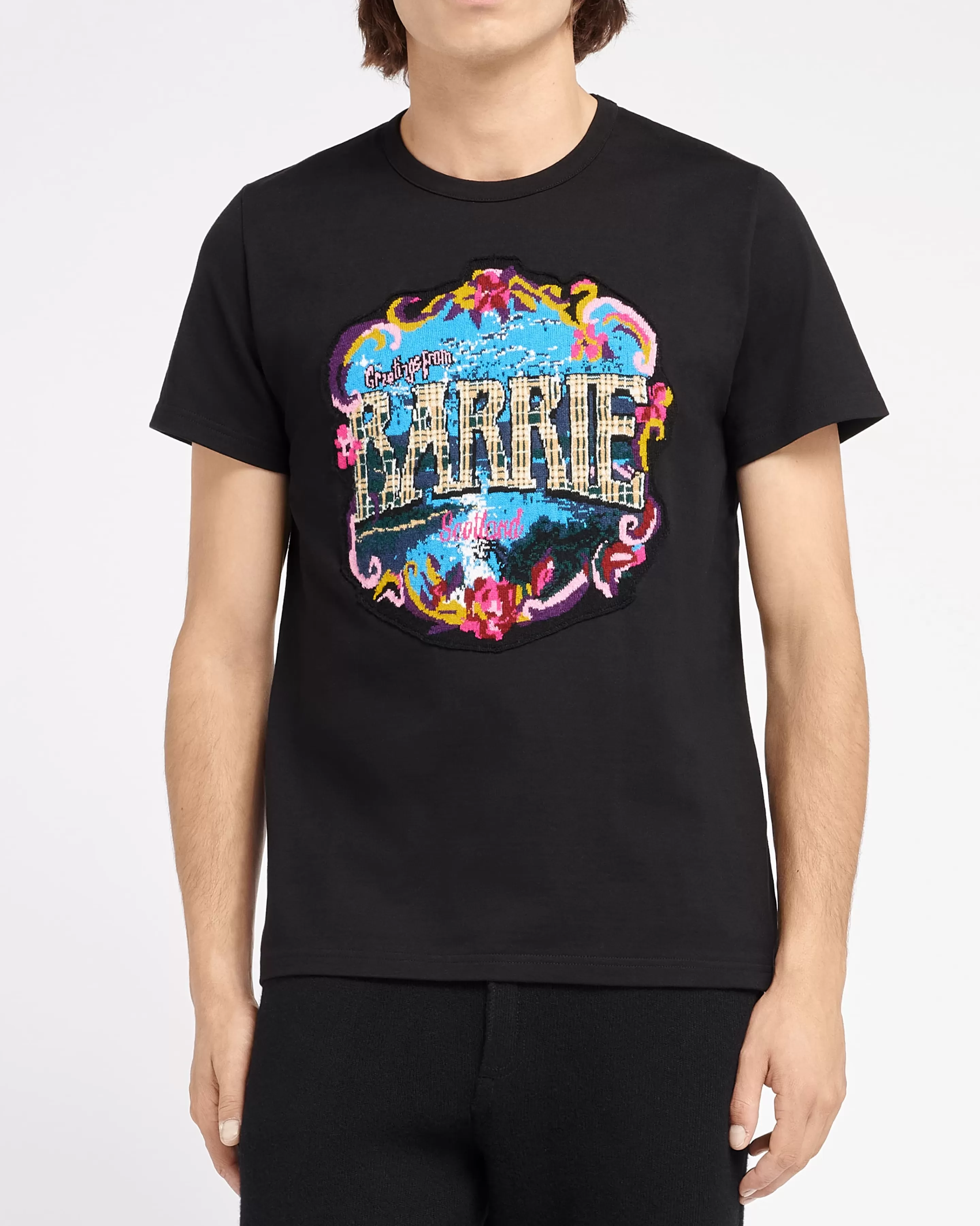 Greetings Capsule CollectionNinspired By The Delightfully Retro Feel Of Vintage Postcards Celebrating The Glories Of Scotland, Barrie Pays Homage To Its Roots With A Charming “Greetings” Capsule Collection. Nthe Capsule Reflects Iconic Scenes Of Scotland Whilst Also Making A Playful Reference To Details From Previous Barrie Collections.NNthis Black T-Shirt In Cotton Is Embellished With A Cashmere Patch Depicting A Floral Bouquet Surrounding A Sparkling Lake Illuminated By The Reflection Of The Moon. The Cashmere Patch Also Features The Barrie Logo In A Nostalgic Typography With Tartan Detailing, Echoing The Heritage Of The House.NNavailable In A Range Of Sizes For Men And Women, This Capsule Is A Must-Have For Fans Of Barrie And The House’s Scottish Spirit.