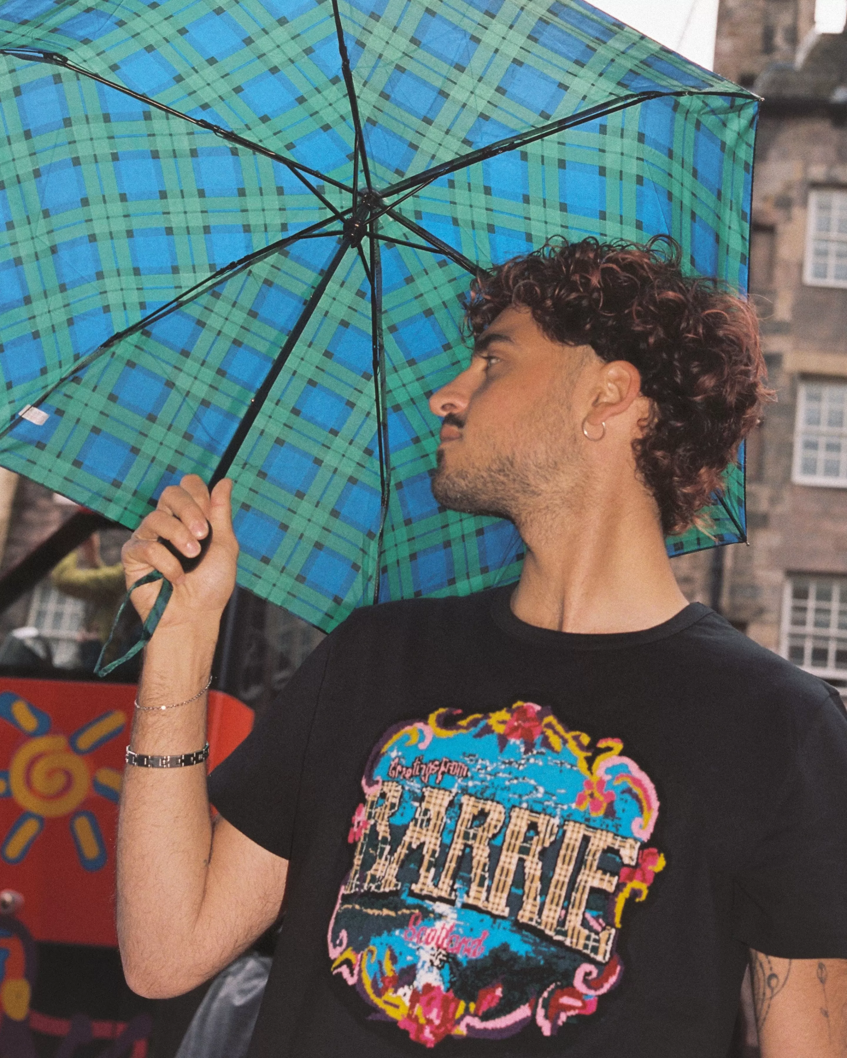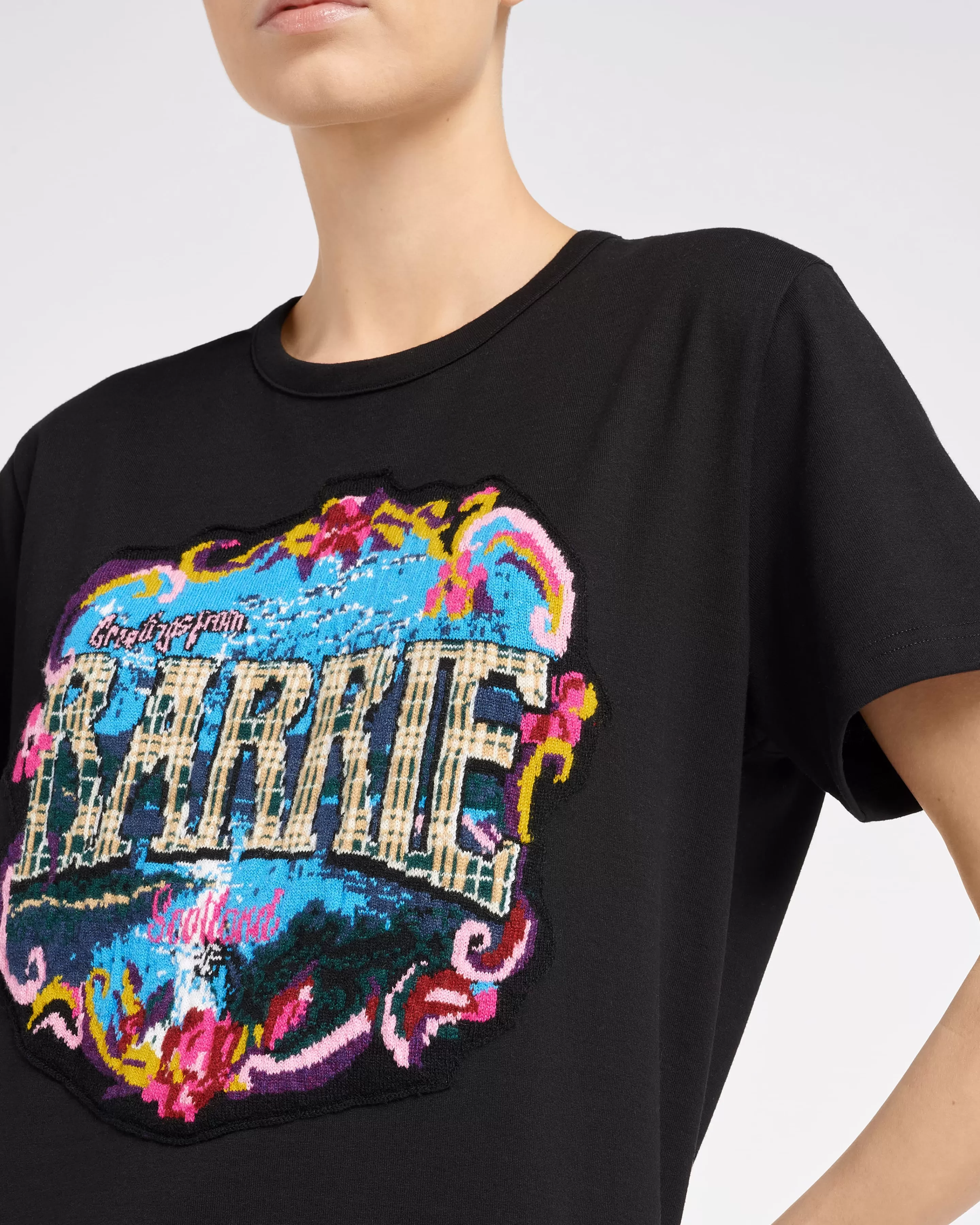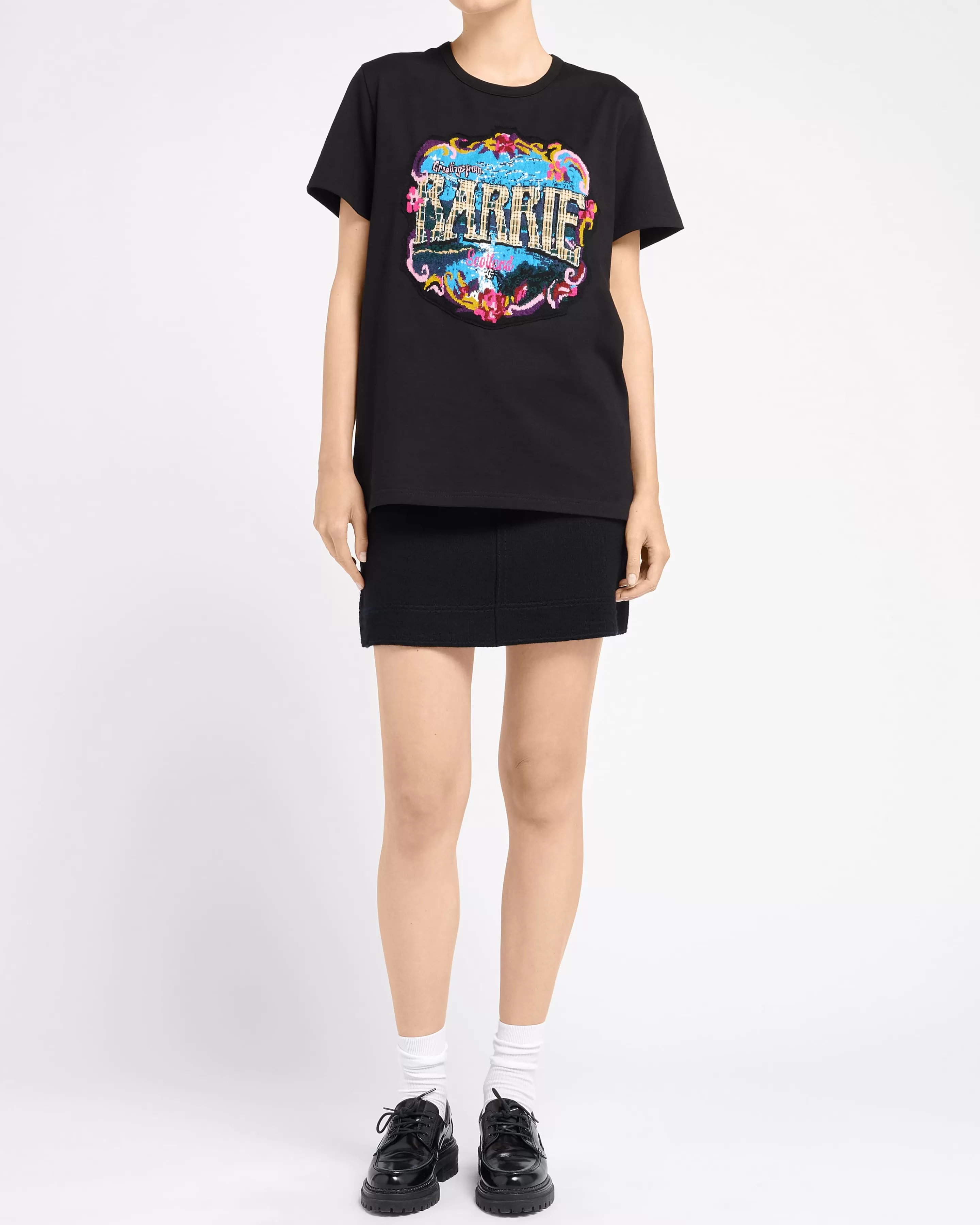Greetings Capsule CollectionNinspired By The Delightfully Retro Feel Of Vintage Postcards Celebrating The Glories Of Scotland, Barrie Pays Homage To Its Roots With A Charming “Greetings” Capsule Collection. Nthe Capsule Reflects Iconic Scenes Of Scotland Whilst Also Making A Playful Reference To Details From Previous Barrie Collections.NNthis Black T-Shirt In Cotton Is Embellished With A Cashmere Patch Depicting A Floral Bouquet Surrounding A Sparkling Lake Illuminated By The Reflection Of The Moon. The Cashmere Patch Also Features The Barrie Logo In A Nostalgic Typography With Tartan Detailing, Echoing The Heritage Of The House.NNavailable In A Range Of Sizes For Men And Women, This Capsule Is A Must-Have For Fans Of Barrie And The House’s Scottish Spirit.