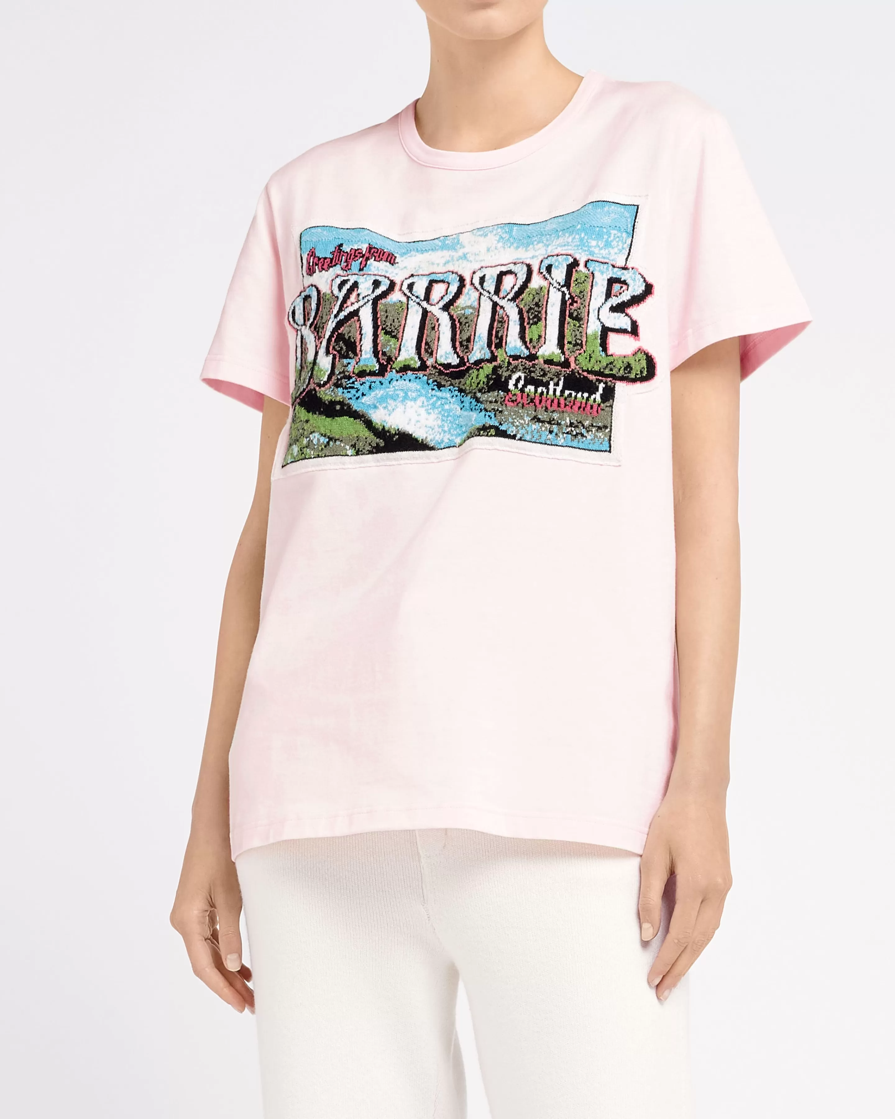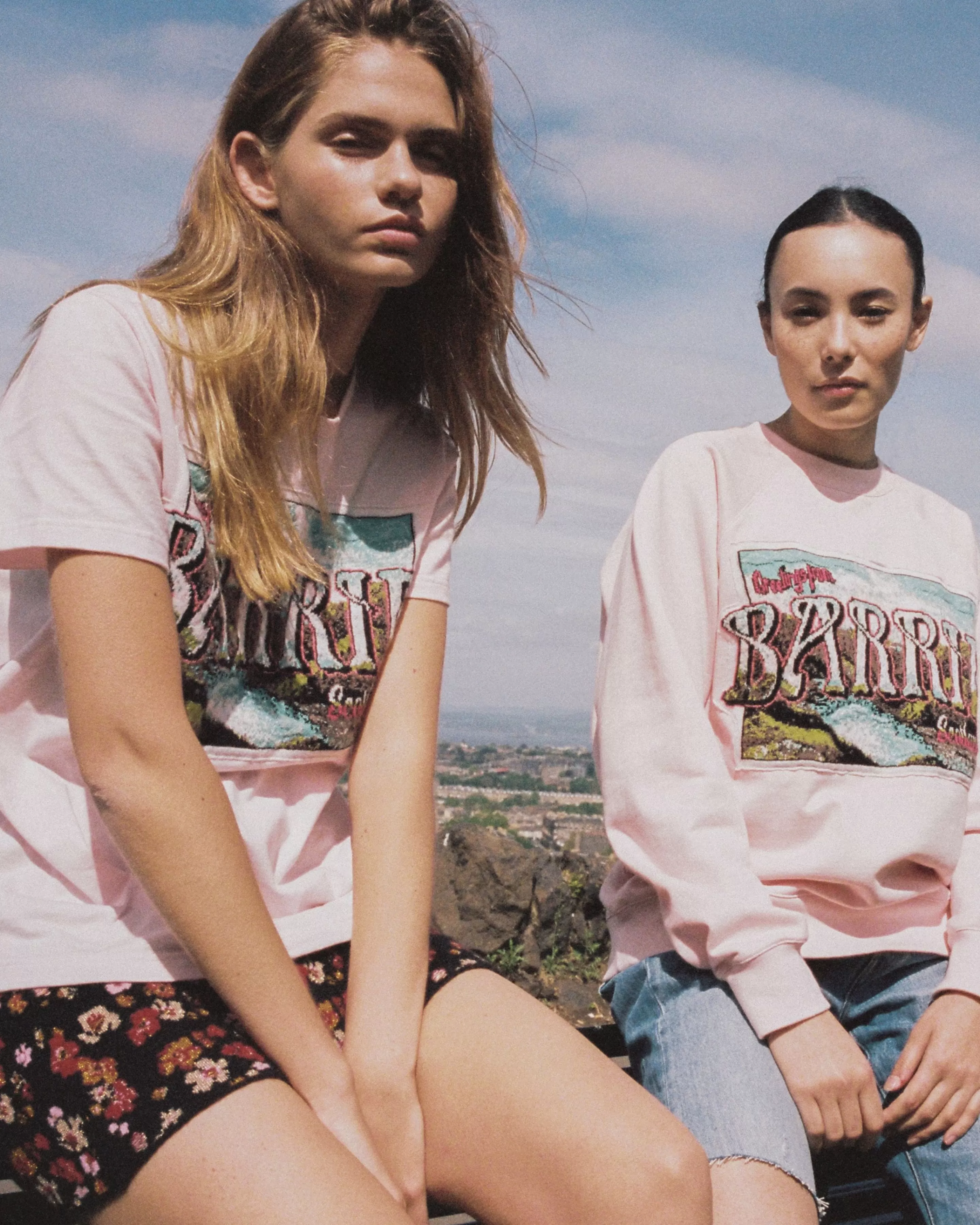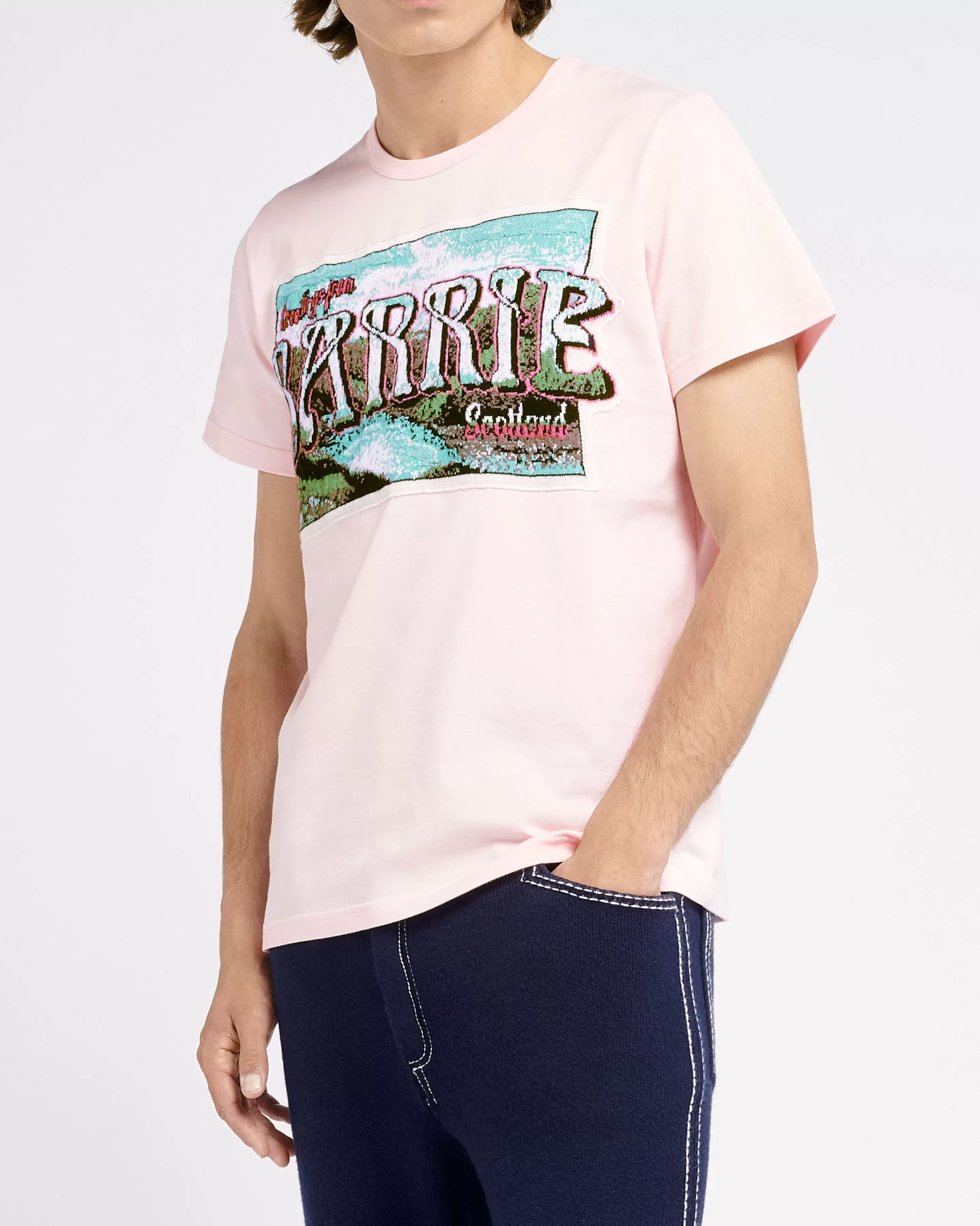 Greetings Capsule CollectionNinspired By The Delightfully Retro Feel Of Vintage Postcards Celebrating The Glories Of Scotland, Barrie Pays Homage To Its Roots With A Charming “Greetings” Capsule Collection. Nthe Capsule Reflects Iconic Scenes Of Scotland Whilst Also Making A Playful Reference To Details From Previous Barrie Collections.NNNNthis Pale Pink T-Shirt In Cotton Is Embellished With A Cashmere Patch Depicting A Sunny Loch. The Cashmere Patch Also Features The Barrie Logo In A Nostalgic Typography With Tartan Detailing, Echoing The Heritage Of The House.NNNimagined In A Range Of Sizes For Men And Women, This Capsule Is A Must-Have For Fans Of Barrie And The House’s Scottish Spirit.NN
