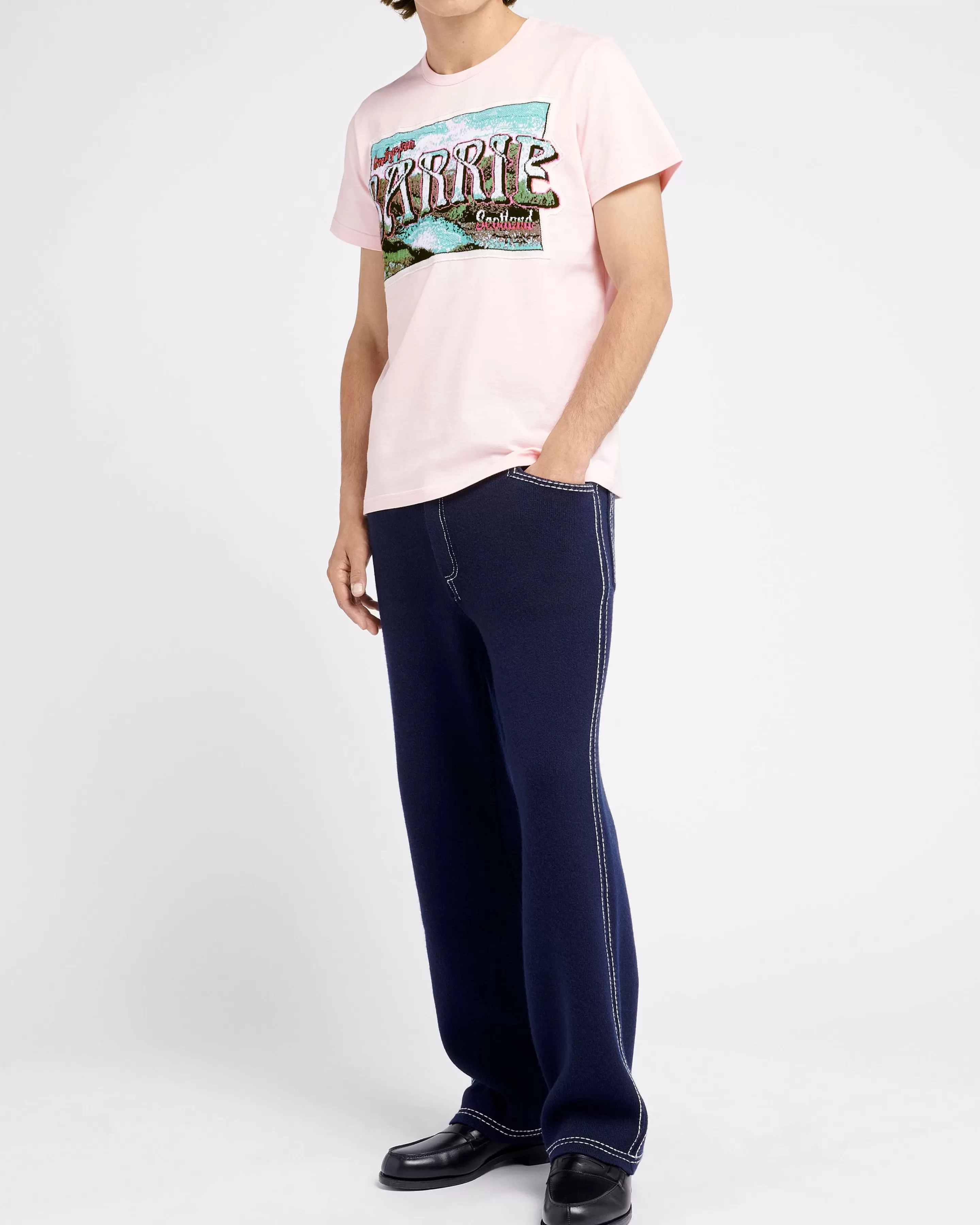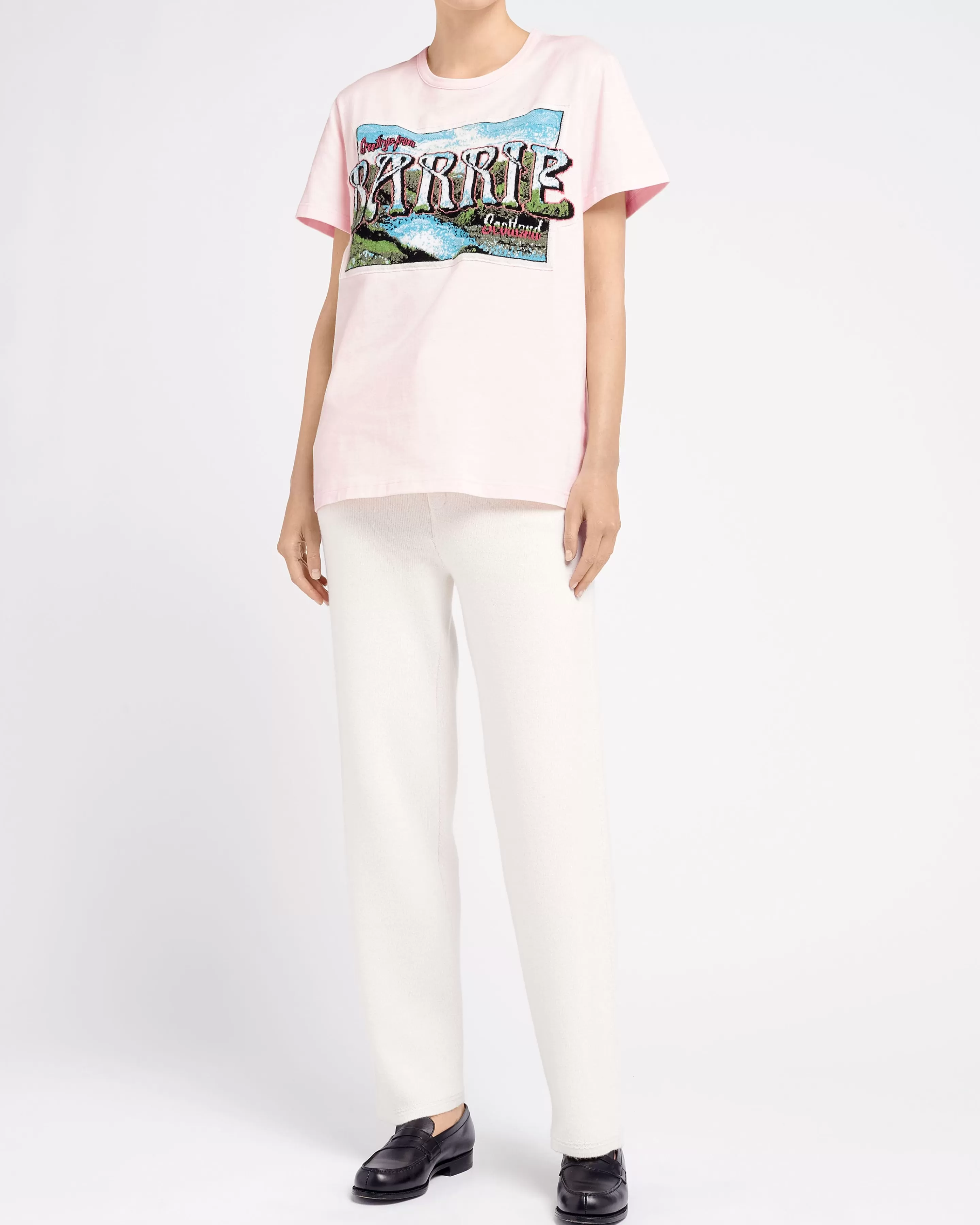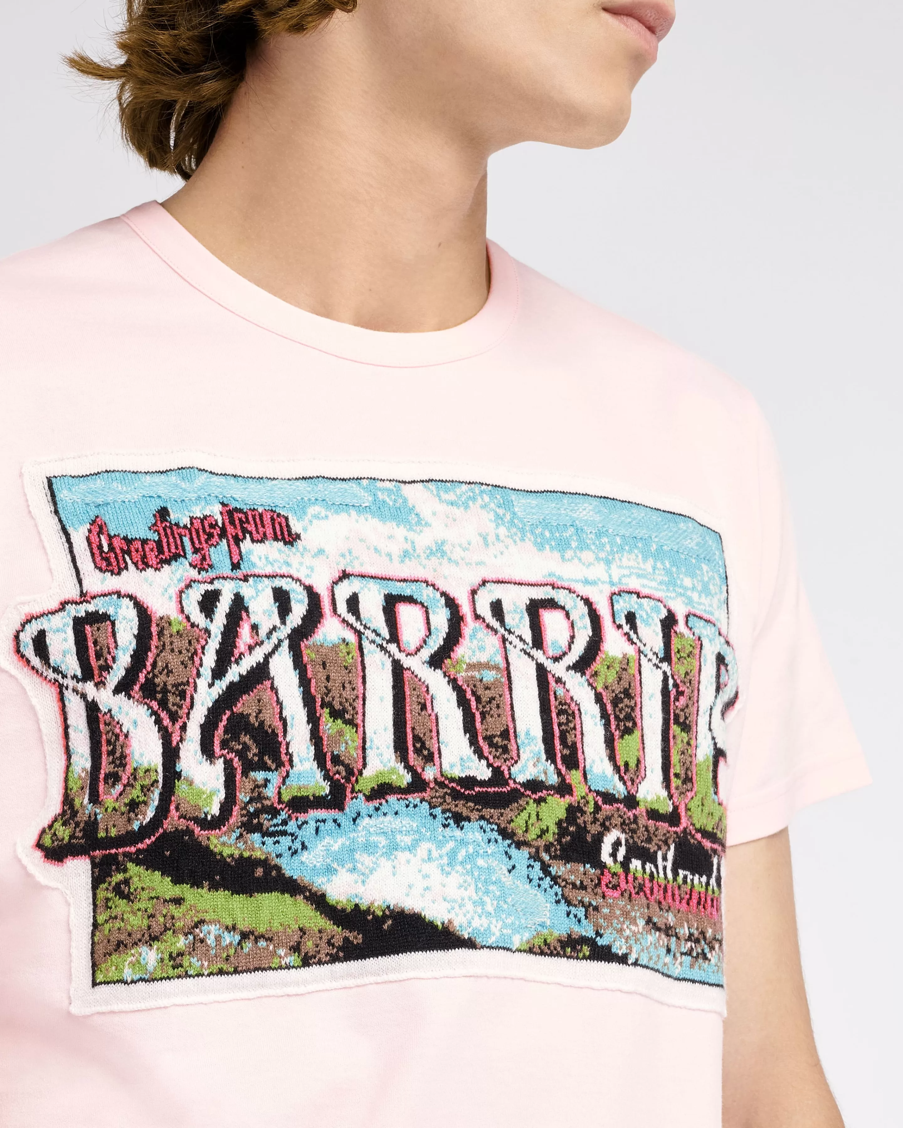 Greetings Capsule CollectionNinspired By The Delightfully Retro Feel Of Vintage Postcards Celebrating The Glories Of Scotland, Barrie Pays Homage To Its Roots With A Charming “Greetings” Capsule Collection. Nthe Capsule Reflects Iconic Scenes Of Scotland Whilst Also Making A Playful Reference To Details From Previous Barrie Collections.NNNNthis Pale Pink T-Shirt In Cotton Is Embellished With A Cashmere Patch Depicting A Sunny Loch. The Cashmere Patch Also Features The Barrie Logo In A Nostalgic Typography With Tartan Detailing, Echoing The Heritage Of The House.NNNimagined In A Range Of Sizes For Men And Women, This Capsule Is A Must-Have For Fans Of Barrie And The House’s Scottish Spirit.NN